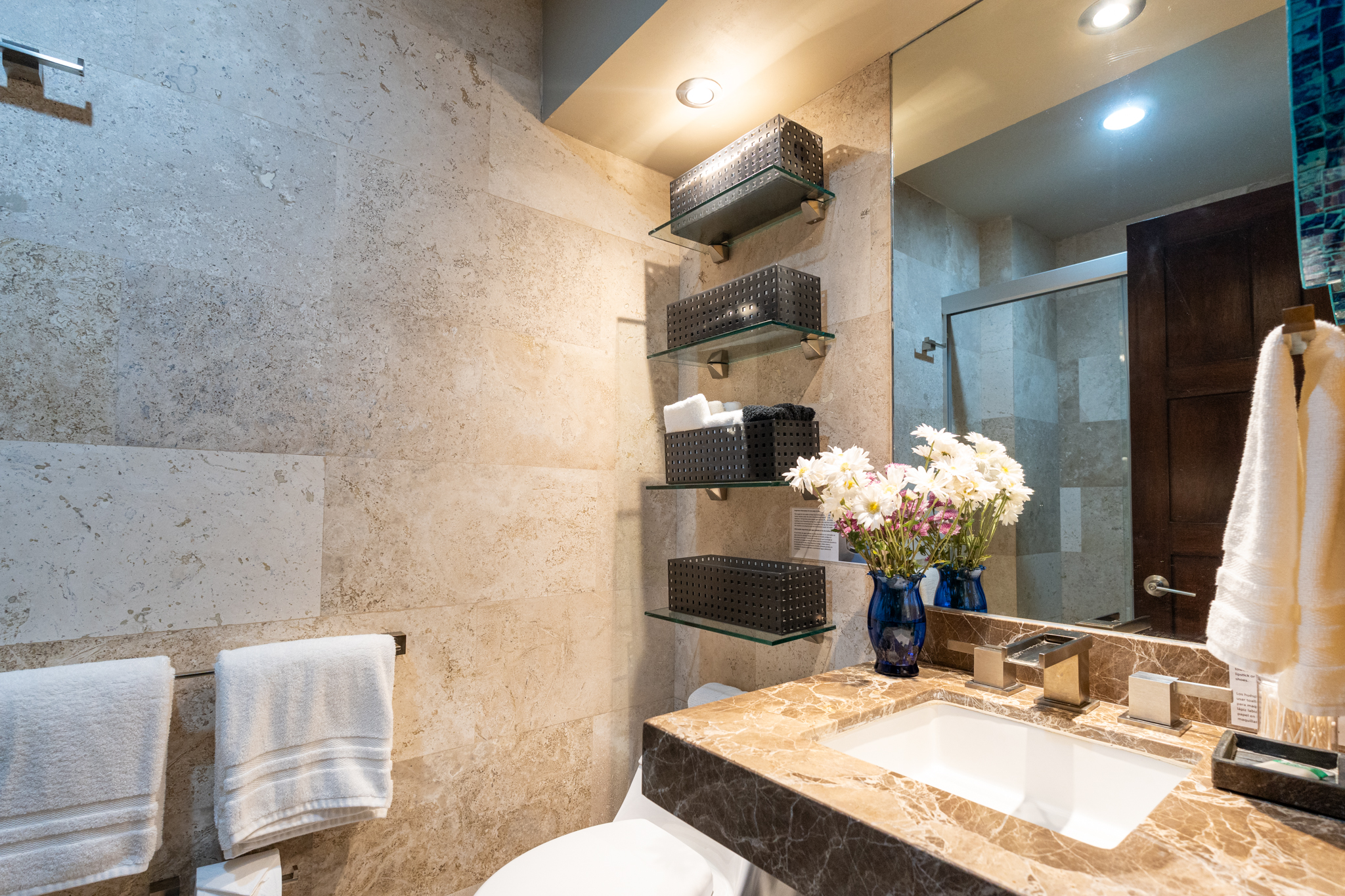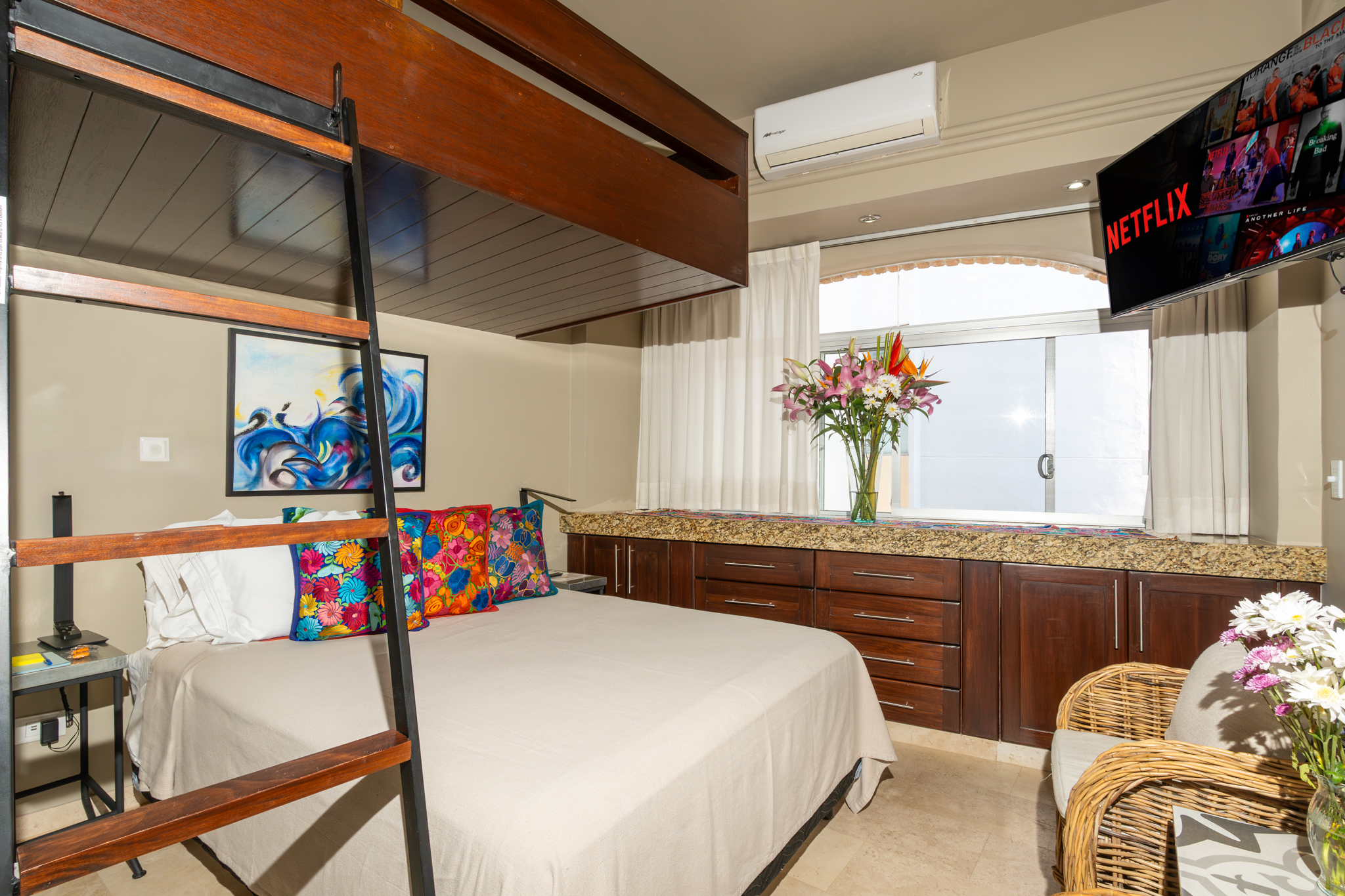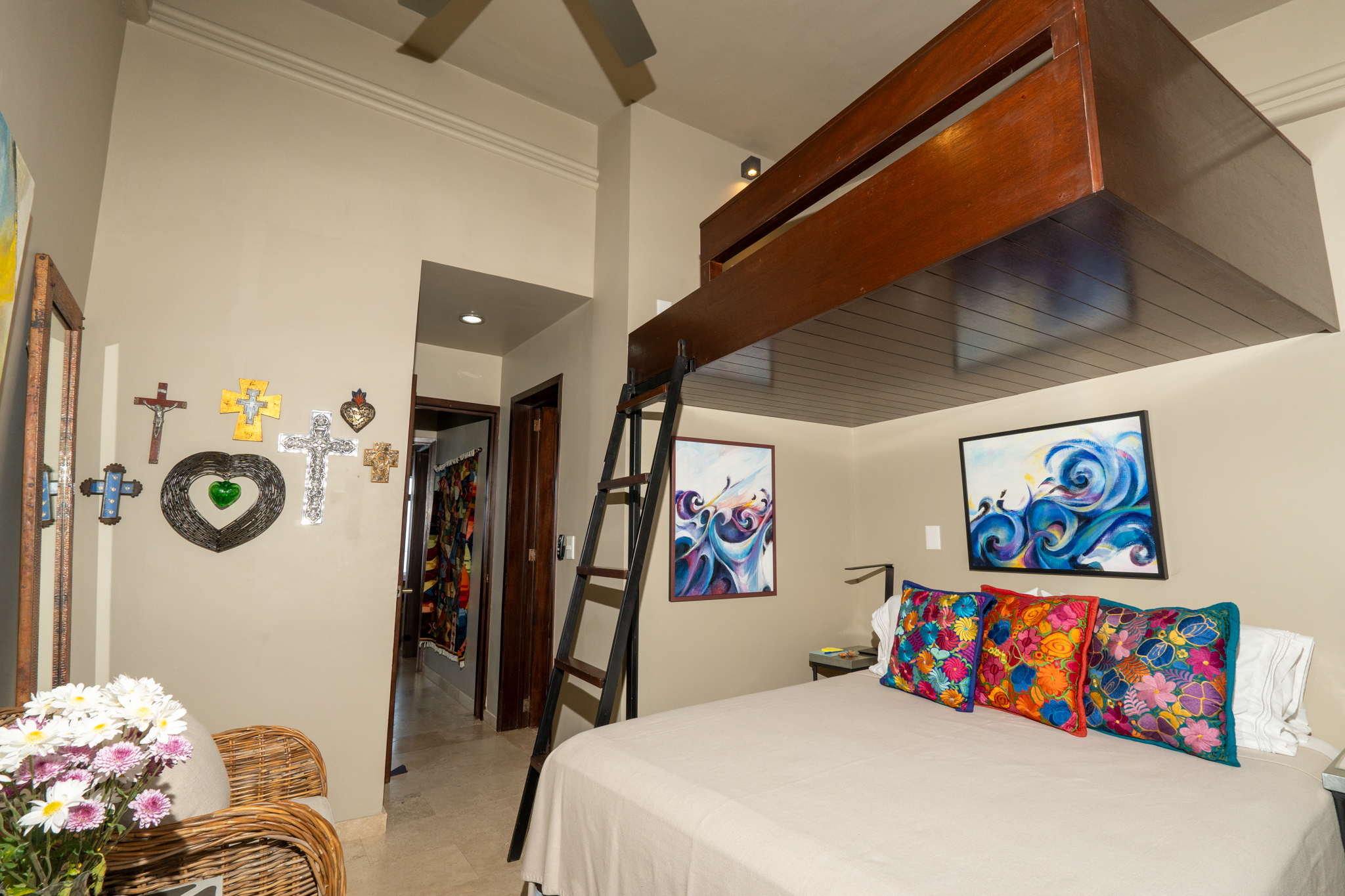 Girasol Sur PH7 is a duplex penthouse condo. On floors 13 & 14, downstairs is a full bath/living room/balcony/and kitchen featuring counter seating. The kitchen is well-equipped with plenty of glasses, dishes, silverware, cookware, a coffee maker, stove top espresso maker, microwave, 4 burner stove, large sink, counter-top convection oven and full refrigerator. The 2nd floor has a master bedroom/balcony and 2nd bedroom each with its own on-suite bathroom. The unit features a stone staircase with a solid, safe railing.