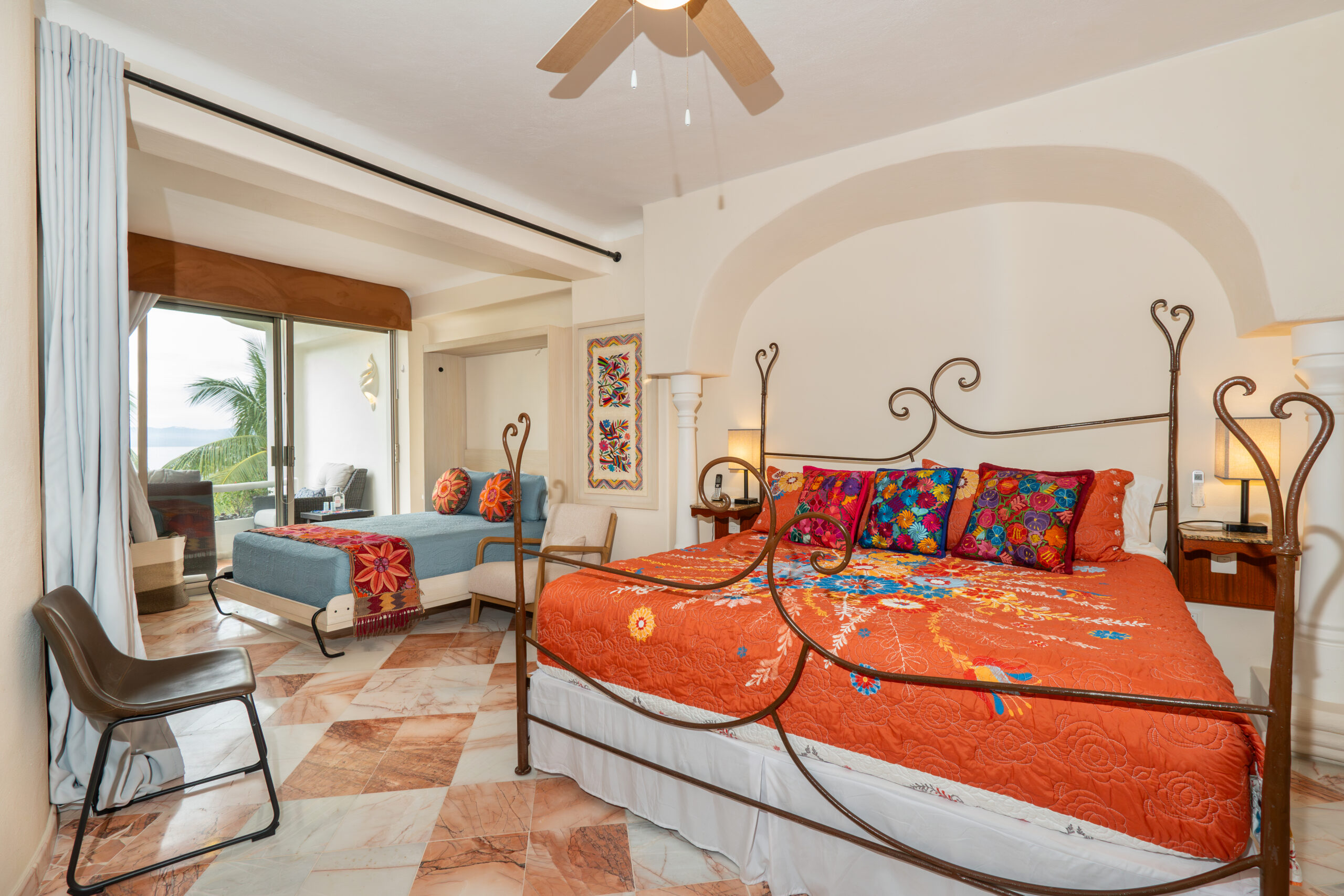 Master bedroom is very spacious with private full bathroom, balcony, king size bed + queen pull down very comfortable murphy bed. Desk working space also located in master bedroom.