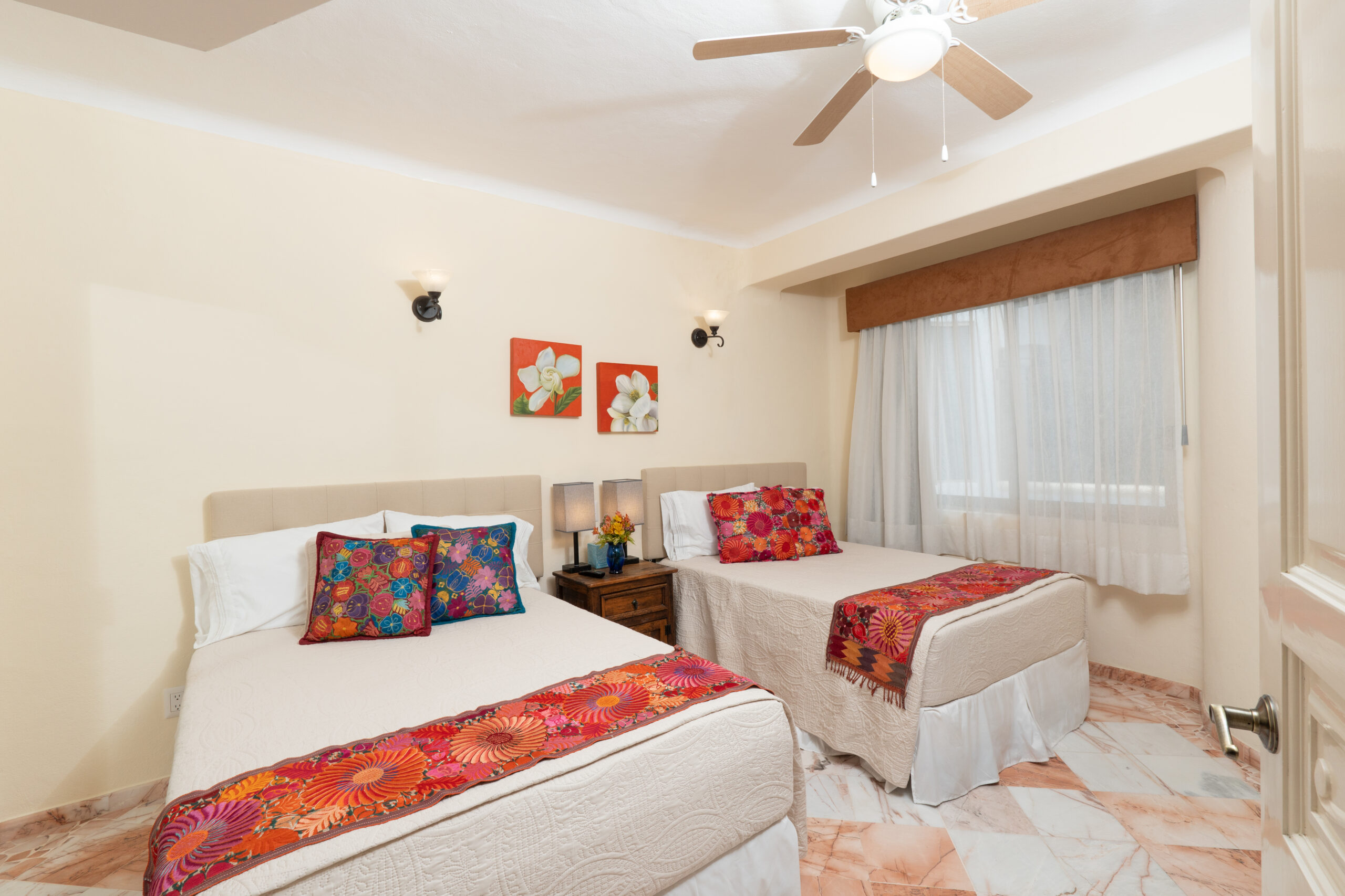 Guest room has two twin beds and attached full bathroom.