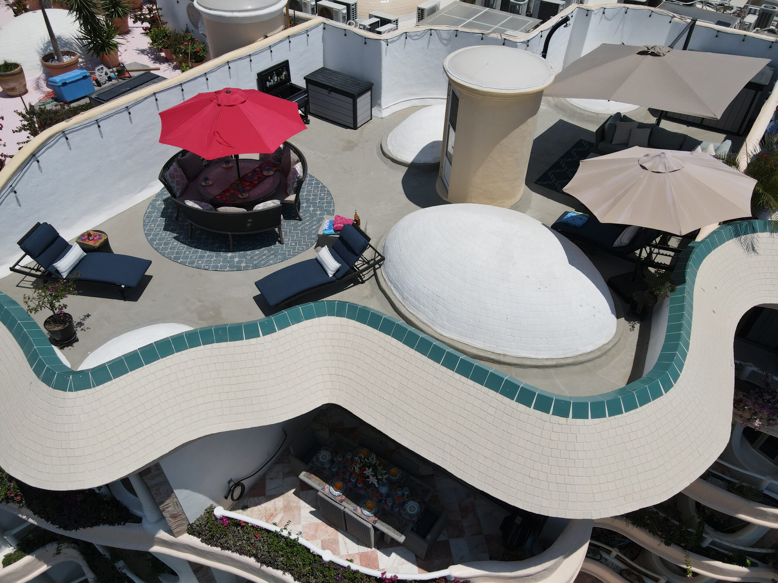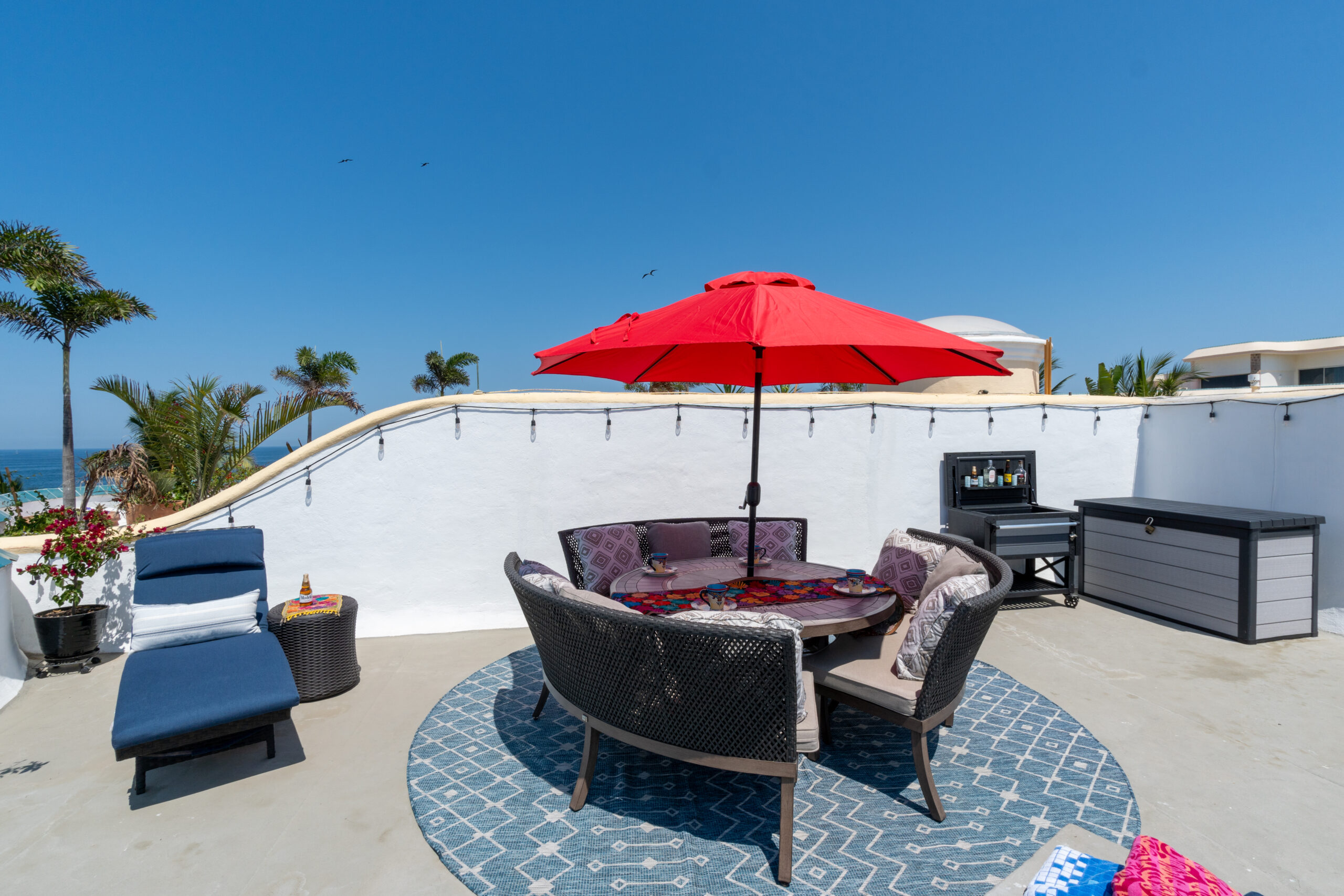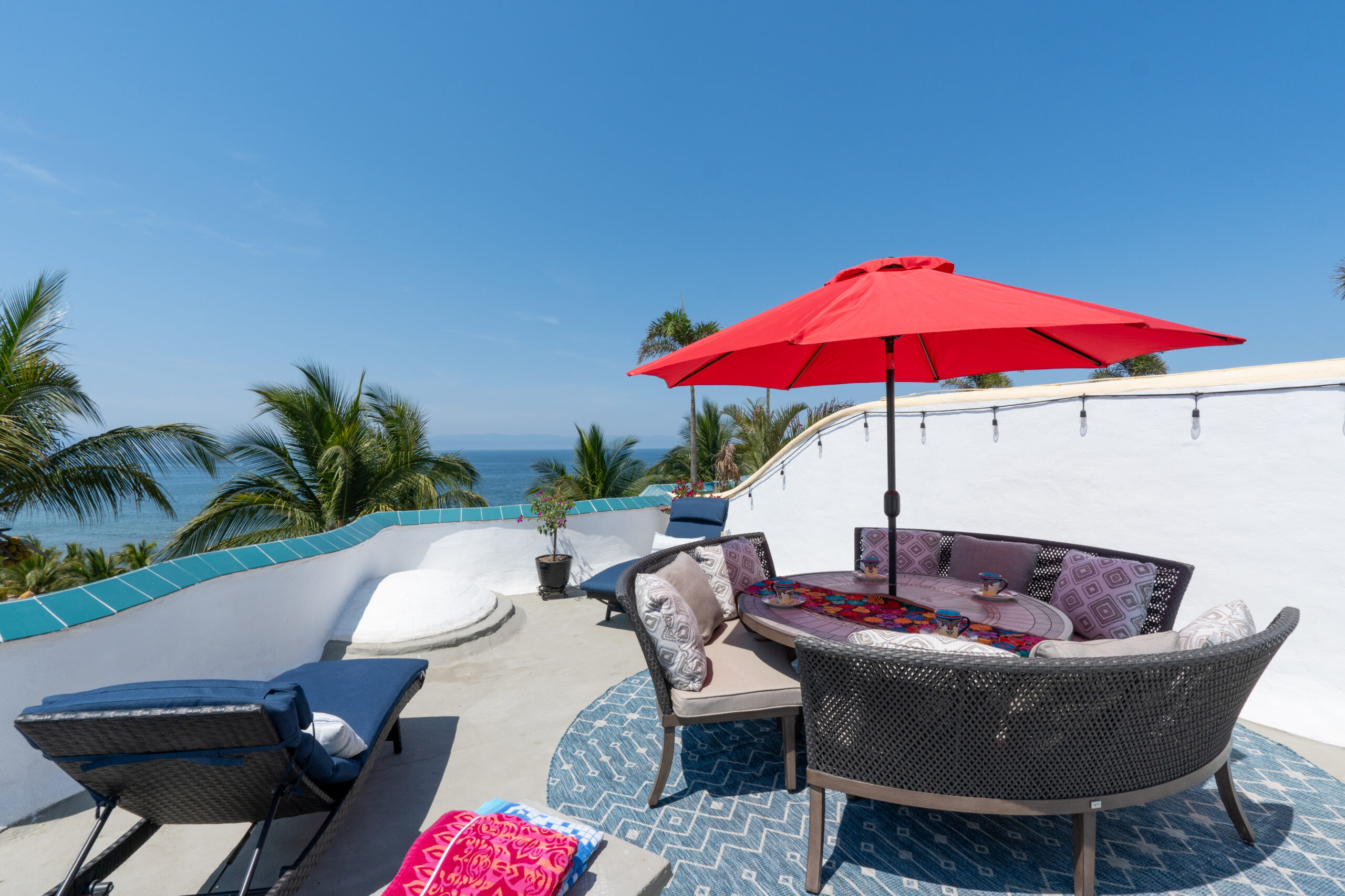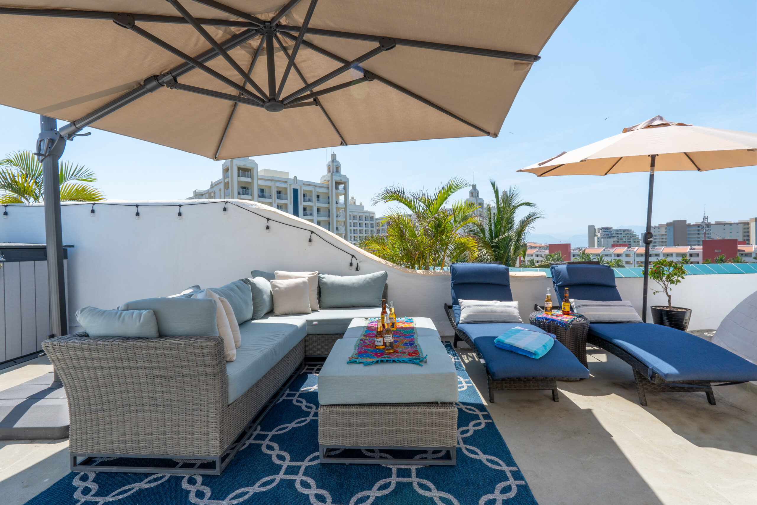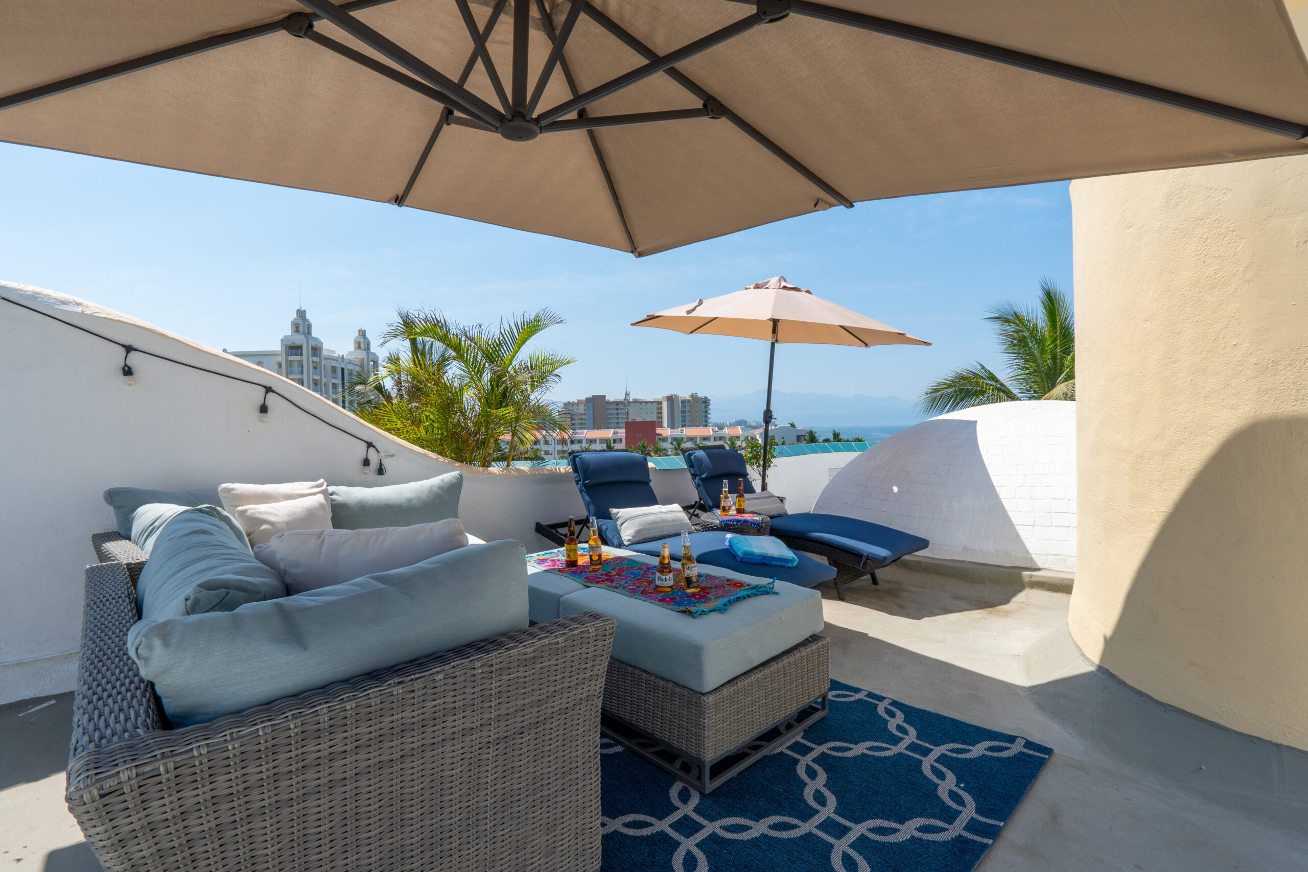 Amazing roof top area, with sun lounge chairs, umbrellas, lounge sofa, and 8 person table/chairs, mini bar furniture, outdoor shower, night time lighting, and amazing full bay / ocean views.