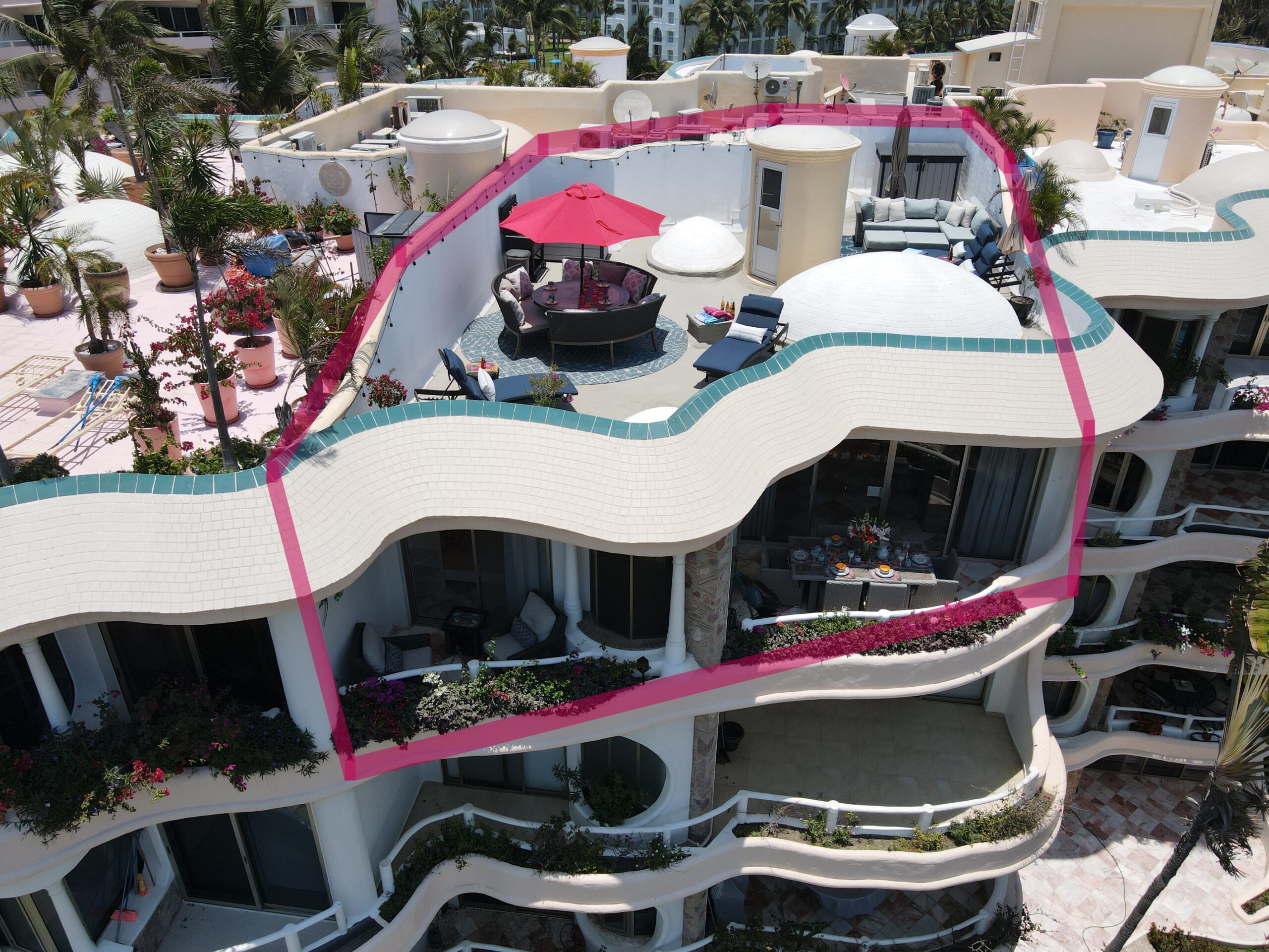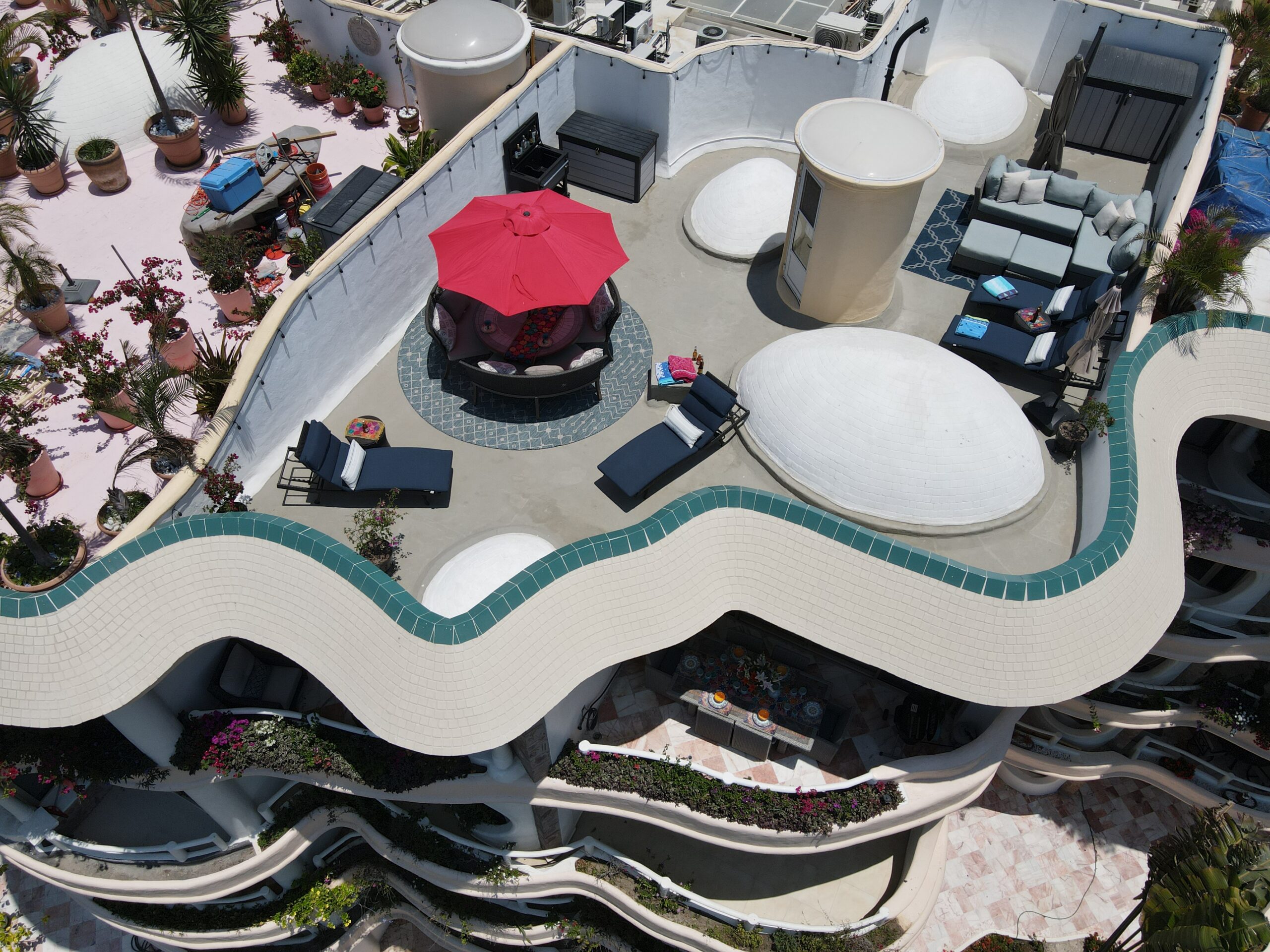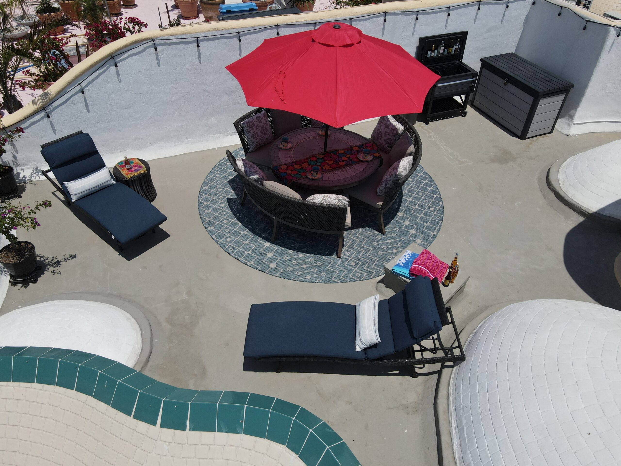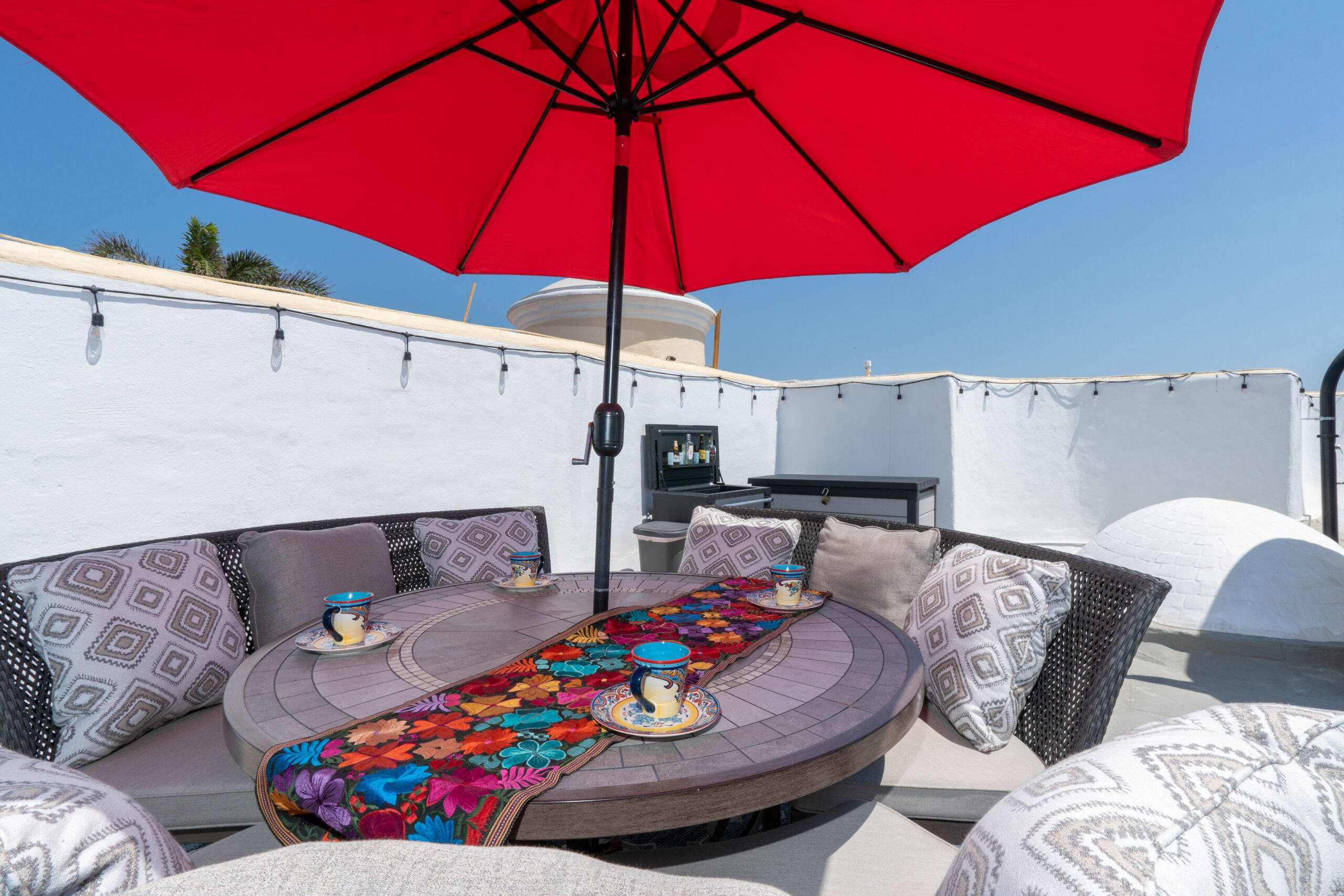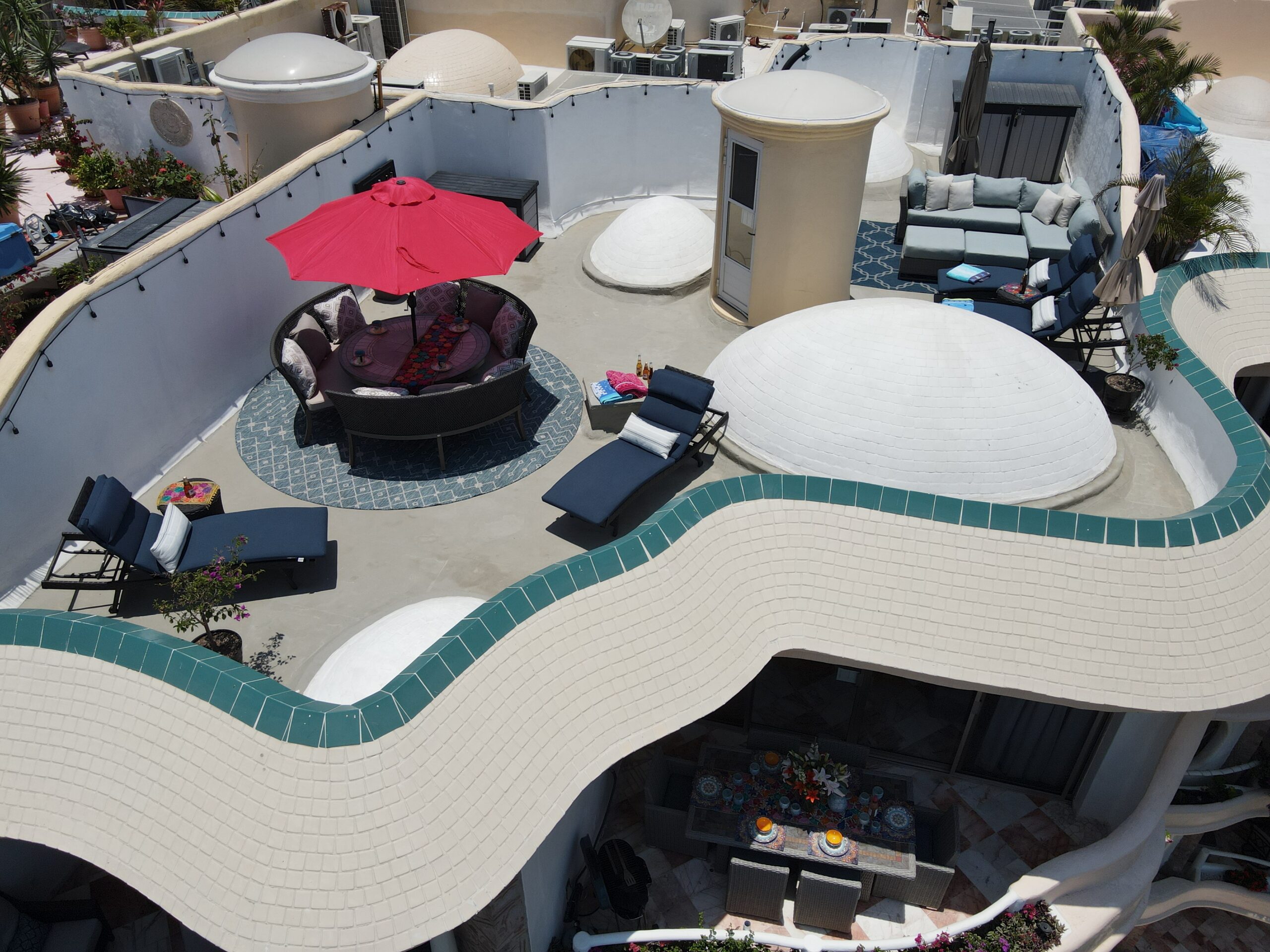 Amazing roof top area, with sun lounge chairs, umbrellas, lounge sofa, and 8 person table/chairs, mini bar furniture, outdoor shower, night time lighting, and amazing full bay / ocean views.