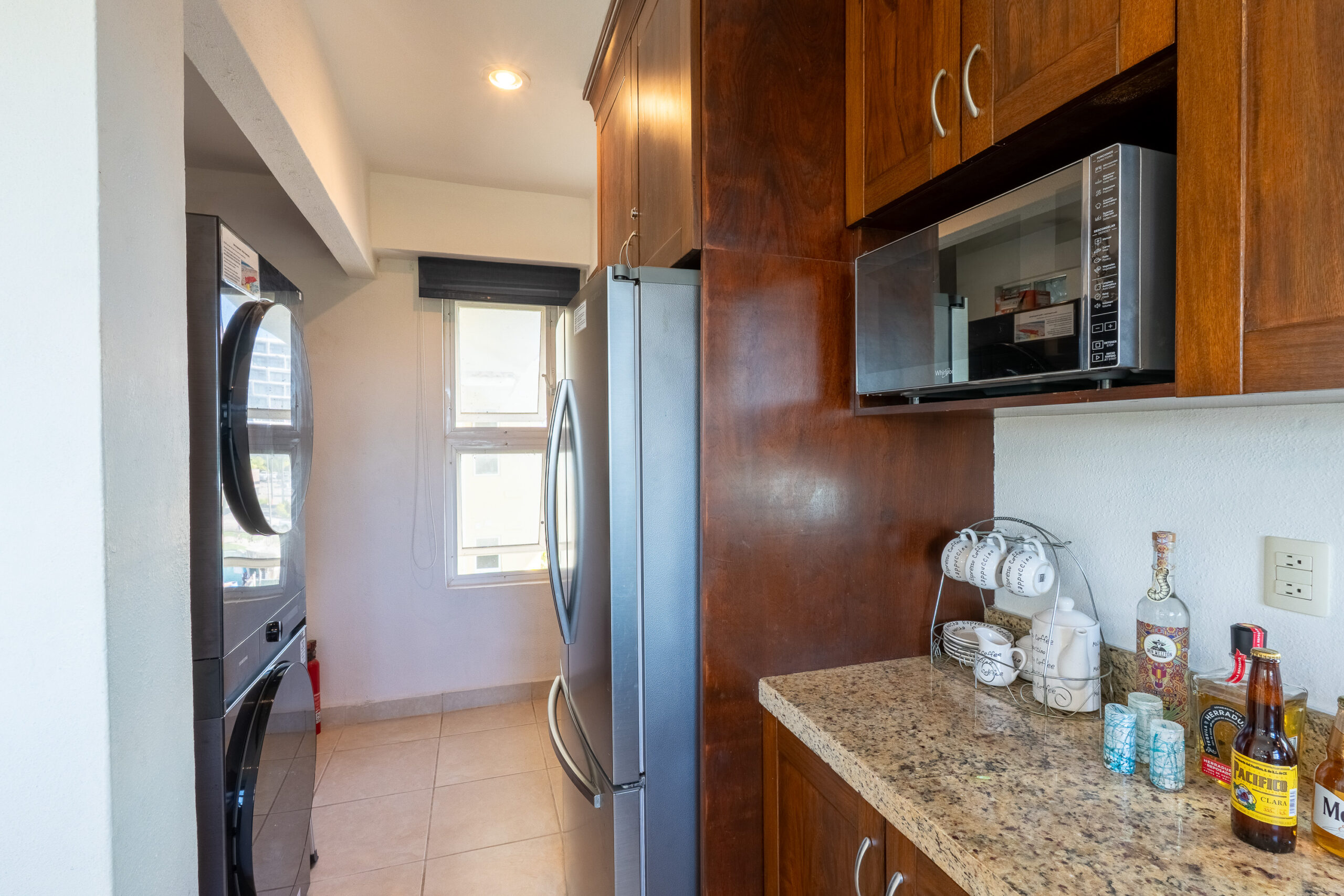 TV in living room. Kitchen with all cookware and dishes provided. Washer/Dryer, private onsite secure parking. Beach chairs, umbrellas, and cooler.