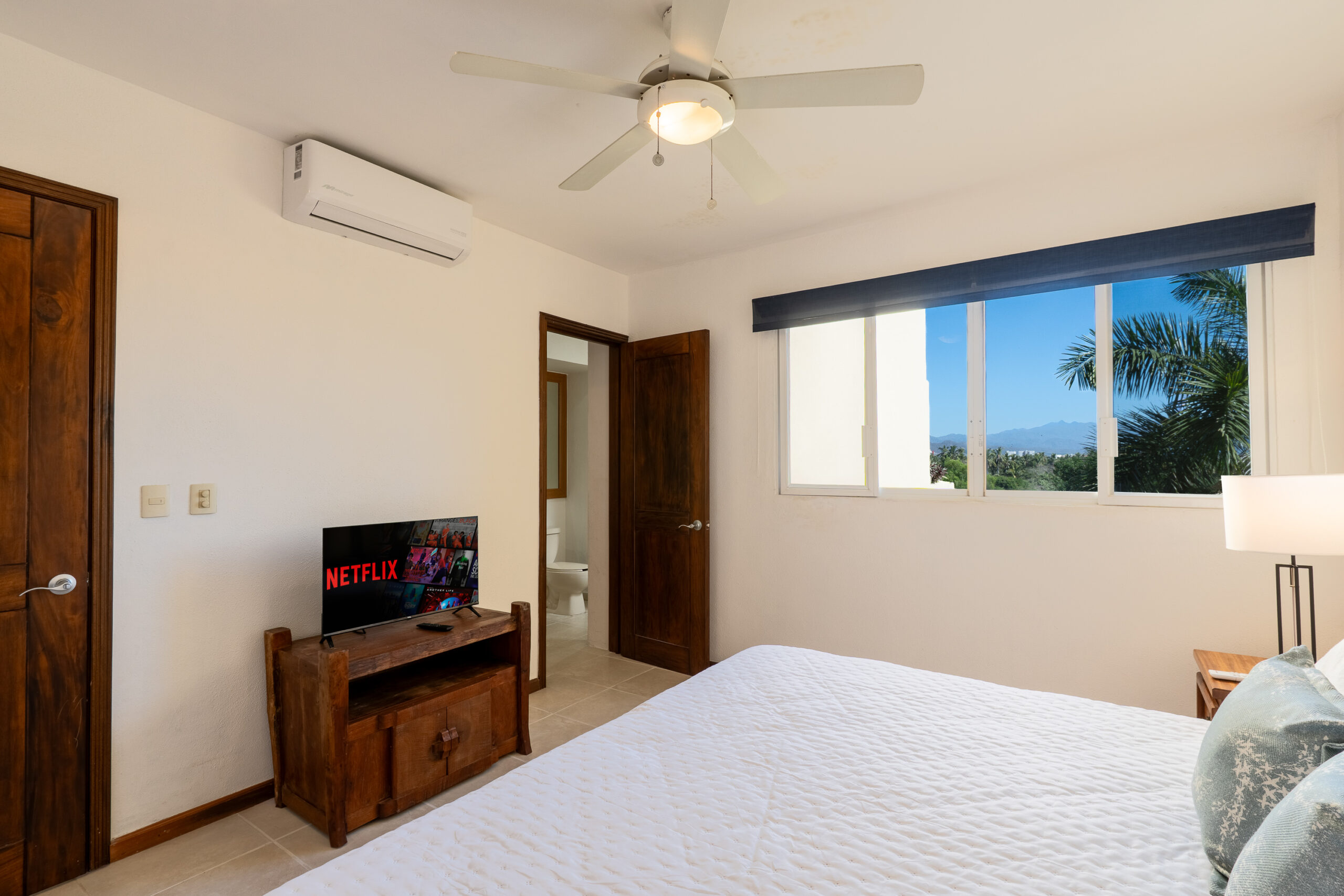 Guest room B has king bed, smart TV and dresser, closet and attached full bathroom.