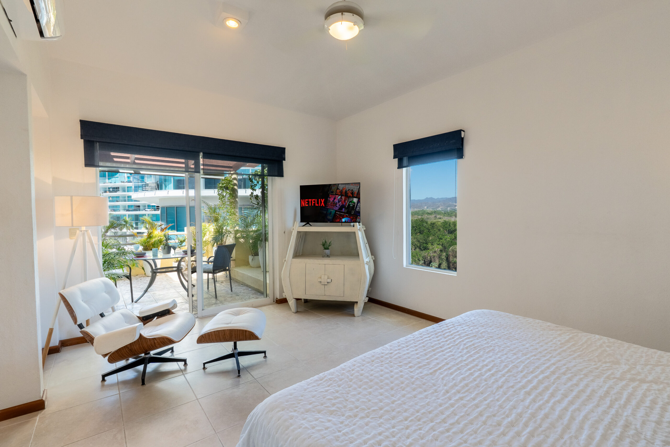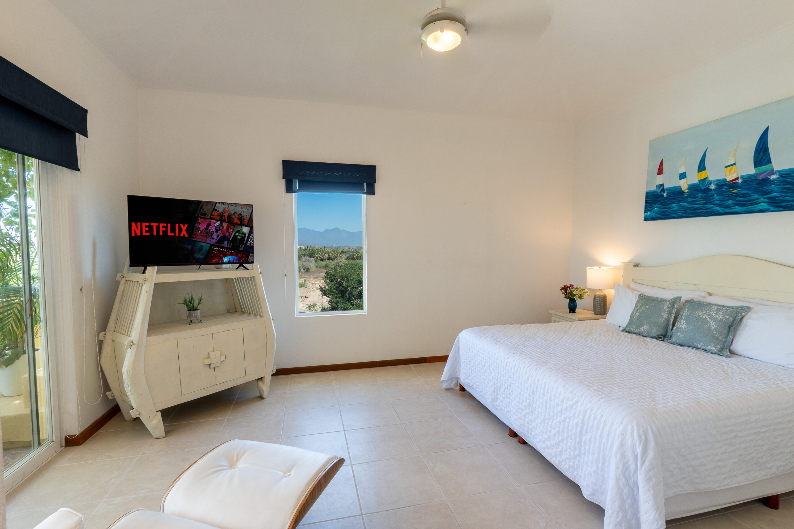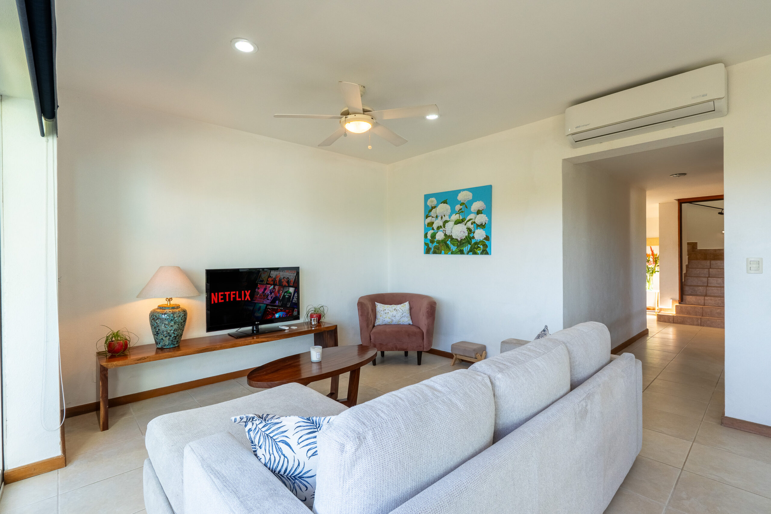 Master bedroom very spacious located upstairs, with king size bed, smart TV, sitting area, with a private terrace private office area for working, private full bathroom with shower and jet tub.